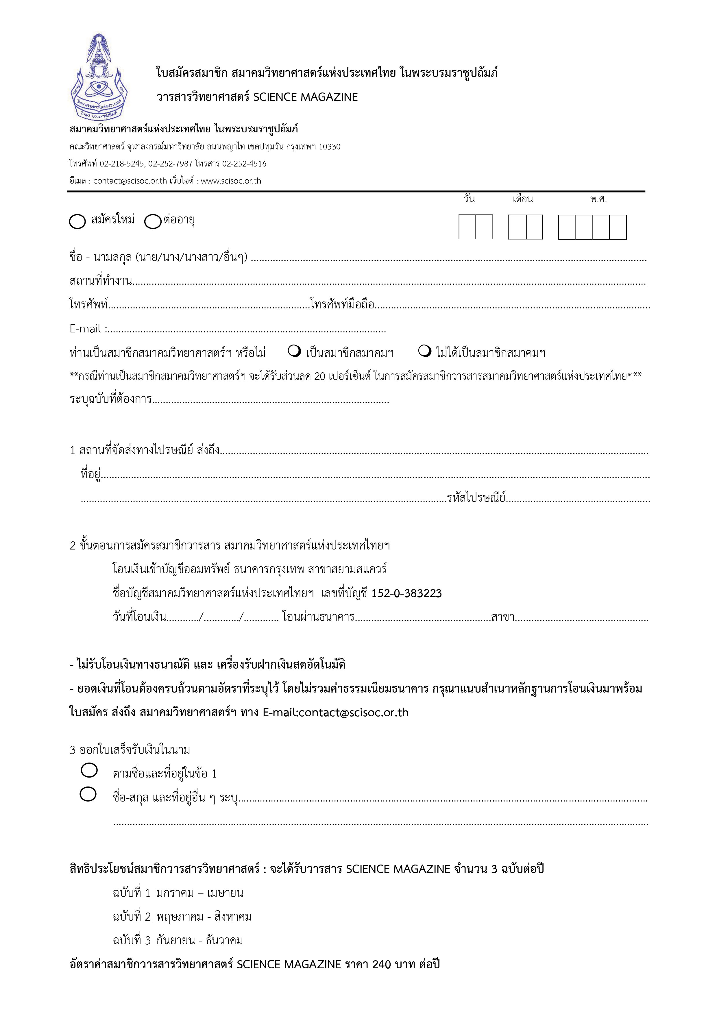 ใบสมัครสมาชิกวารสารวิทยาศาสตร์ SCIENCE MAGAZINE