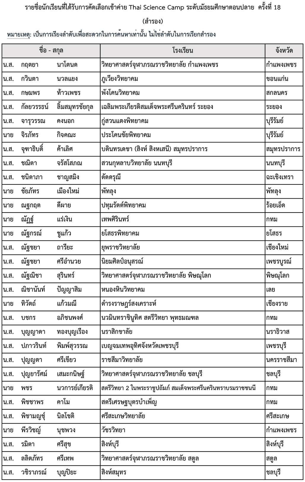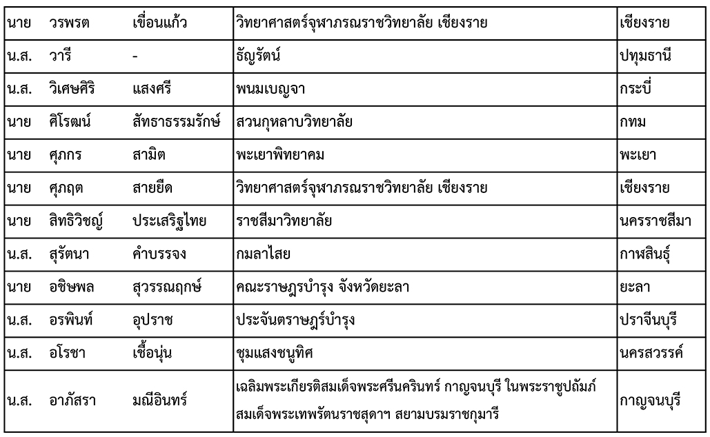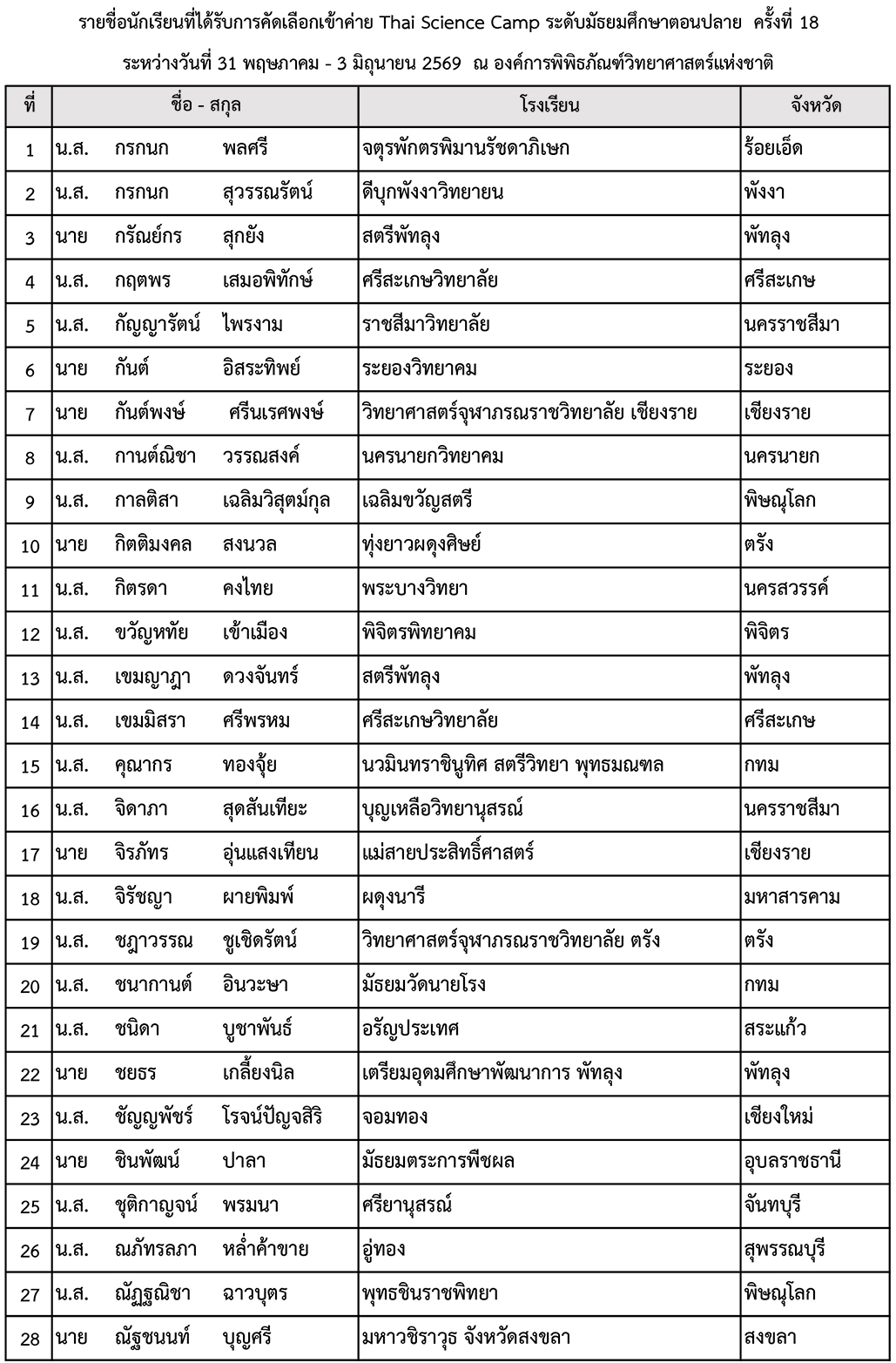 สมาคมวิทยาศาสตร์แห่งประเทศไทยในพระบรมราชูปถัมภ์ ขอประกาศรายชื่อผู้มีสิทธิเข้าค่าย Thai Science Camp ระดับมัธยมศึกษาตอนปลาย ครั้งที่ 18 ระหว่างวันที่ 31 พฤษภาคม - 3 มิถุนายน 2569 ณ องค์การพิพิธภัณฑ์วิทยาศาสตร์แห่งชาติ (อพวช.)